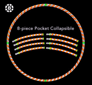 Our ultra-portable collapsible hoop, the Pocket Hoop is constructed with eight sections of tubing that disconnect via button snaps into eight convenient pieces that fit inside our hoop bag AND inside carry-on luggage or tote bags. While the regular assembled diameters are sized for full body hooping and a focus on your core, the Pocket hoops can be assembled using only 6 or 7 sections to create a smaller hoop – great for arm hooping, isolations or small kids! The extra sections add a little extra weight, so the Pocket is even better for core exercise than the Quattro.
